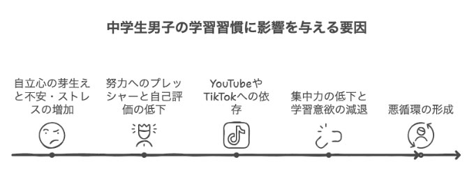 思春期の中学生男子は、自立心が芽生える一方で、多くの不安やストレスを抱えています。勉強に対するプレッシャーや、成績が下がってしまったことへの焦りが、彼らをさらに追い詰めているのかもしれません。