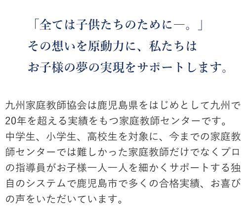 そんな鹿児島市で九州家庭教師協会は20年以上にわたって地域密着で指導を行っています。必要やご要望に応じてオンライン家庭教師も可能です。